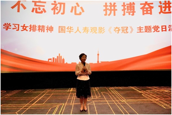 电影放映前,国华人寿党委书记周文霞围绕“弘扬女排精神”主题,深刻阐述了女排精神的历史背景、发展脉络以及女排精神所产生的深远意义。
